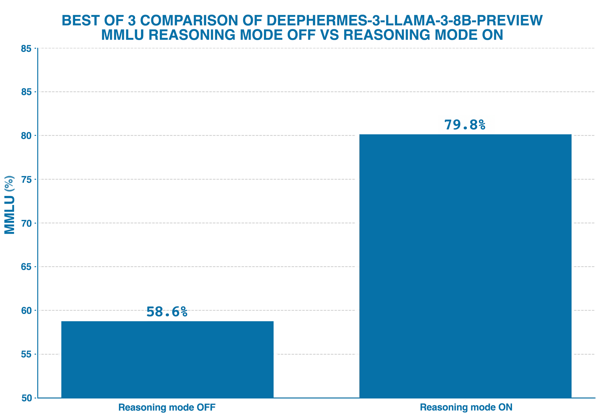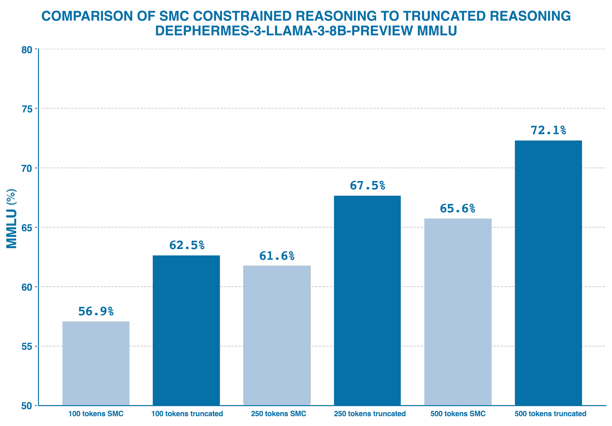 To explore this further, we used the SMC framework and our inference server to evaluate thinking-length constraints with the DeepHermes-3-Llama-3-8B-Preview model. This model was chosen specifically because it provides visibility into the model's reasoning traces, allowing us to analyze the impact of controlling reasoning length on the full MMLU set.